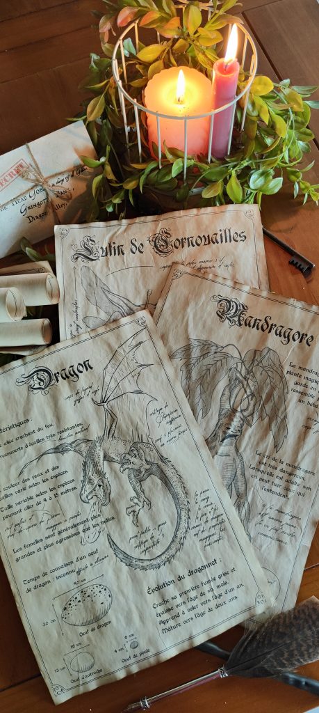 Faire vivre l’univers fantastique, encore, parce qu’on adore ! En tant que grande fan de l’univers de J.K. Rowling, je me suis fait des petits fan art ! Recherches, dessin, mise en page par photoshop, puis vieillissement du papier pour faire un effet parchemin (d’ailleurs, j’ai écrit un article pour vous expliquer ma méthode), et impression !